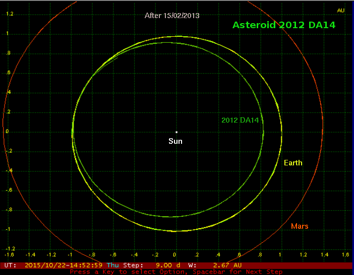 Di seguito rappresentazione grafica del passaggio ravvicinato alla Terra dell'asteroide 2012 DA14, si apprezza la variazione dell'orbita. (Software Solex 11.0)