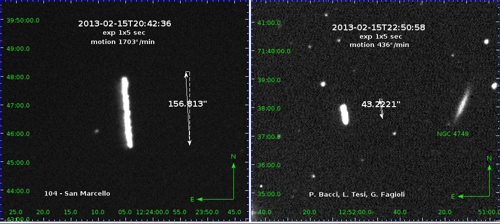 La sera del 15 febbraio 2013 dall'osservatorio astronomico di San Marcello Pistoiese - 104 -, Netwon 0.60-m F/4, CCD Apogee 1024x1024 pixel, FOV 34'x34', risoluzione immagine di 2"/pixel, è stato seguito il passaggio dell'asteroide.