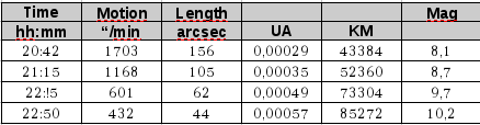 Nel corso della serata sono state acquisite varie immagini dalle quali è stato possibile determinare il motion dell'asteroide che sommariamente si riporta nella seguente immagine.