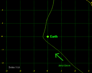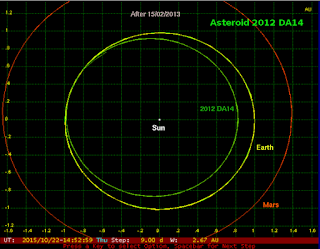 Di seguito rappresentazione grafica del passaggio ravvicinato alla Terra dell'asteroide 2012 DA14, si apprezza la variazione dell'orbita. (Software Solex 11.0)