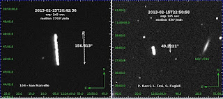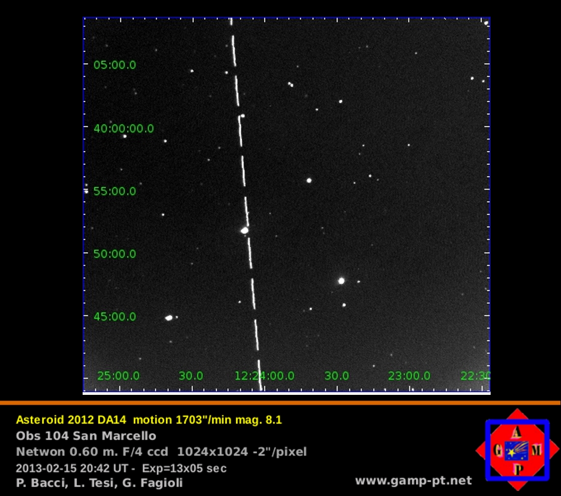 La sera del 15 febbraio 2013 dall'osservatorio astronomico di San Marcello Pistoiese - 104 -, Netwon 0.60-m F/4, CCD Apogee 1024x1024 pixel, FOV 34'x34', risoluzione immagine di 2"/pixel, è stato seguito il passaggio dell'asteroide.