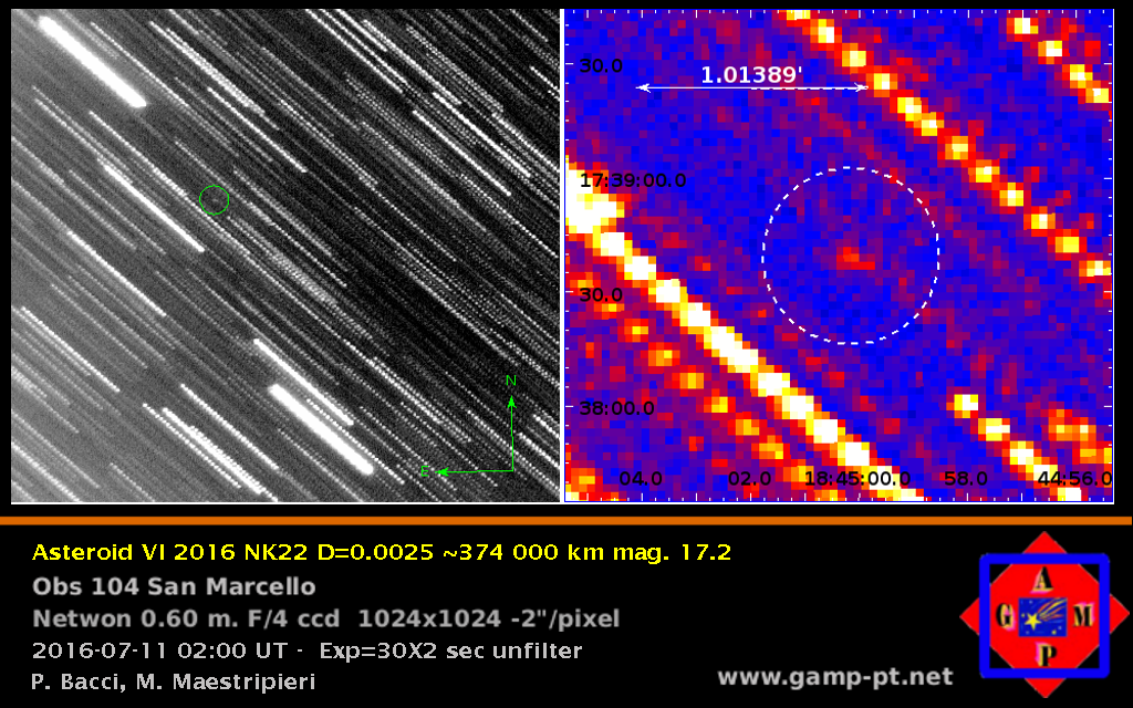 Dall'Osservatorio Astronomico della Montagna Pistoiese (codice MPC 104), struttura del comune di San Marcello e gestita dal GAMP – Gruppo Astrofili Montagna Pistoiese – gli astrofili Paolo Bacci e Martina Maestripieri utilizzando le effemeridi elaborate dal NEODyS di Navacchio (Pisa), sono riusciti ad individuare, osservare e misurare l'asteroide 2016 NK22.