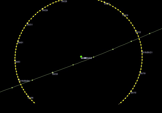 L'asteroide con un diametro stimato tra 18 e 57 metri, poche ore dopo è passato sopra le nostre teste ad una distanza di sole 0.2 LD, cosi come mostrato nella immagini seguente effettuate con il software SOLEX, dove si mostra al centro in colore verde la Terra, in giallo l'orbita della Luna ed in verde il percorso dell'asteroide 2016 QA2.
