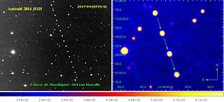 Immagine dell'asteroide 204 JO25 ottenuta dall'osservatorio di San Marcello. Sono state sommate vaie immagine per mostrare il percorso sulla volta celeste dell'oggetto. A sinistra un immagine in falsi colori dove si evidenzia la direzione del moto dell'asteroide con frecce di colore verde.