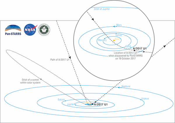 L'asteroide A/2017 U1 sta lasciando il nostro Sistema Solare in direzione della costellazione di Pegaso. Se pur poco più grande di 150 metri, U1 ha permesso di confermare quanto ipotizzato e mai prima di ora verificato, ed è stato possibile compiere una storica scoperta che rimarrà negli annali dell'astronomia alla quale seguiranno ulteriori studi e probabilmente programmi spaziali già annunciati.