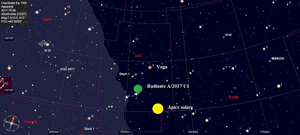 L'asteroide A/2017 U1 è il primo nella storia dell'astronomia ad avere un'orbita iperbolica, andando così a confermare la presunta esistenza di oggetti provenienti da mondi lontani. Dai preliminari studi risulta essere stato espulso da un sistema nella costellazione della Lira. (Figura 4)