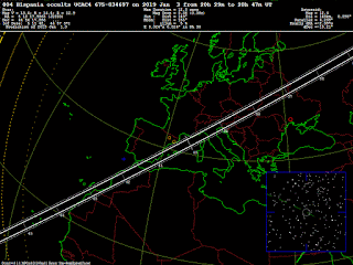 La sera del 03 gennaio 2018 era previsto che l'asteroide (804) Hispania di 12.4 mag avrebbe occultato la stella UCAC4 675-034697 di 13.4V mag. per una durata di 12.3 sec e un drop di 0.36 mag.