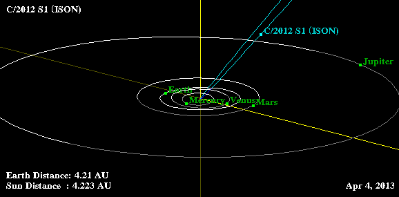 La ISON si trova oltre l'orbita di Giove a una distanza di Delta =5.317 e r = 5.753, ma nonostante ciò è attiva ed abbastanza luminosa 16 mag (MPC m1 17.2)